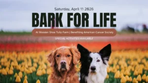 Wooden Shoe Events CalendarView all Upcoming Events Visit UsEvents CalendarBloom TimesDirections to the FarmSupport LocalLodgingBark For LifeDate: Saturday, Apr 11, 2026Mark your calendars! Join us during Bark for Life on April 11th to support the American Cancer Society! Bring your pup to enjoy special activities, prizes and vendors from 11am – 2pm Buy Tickets