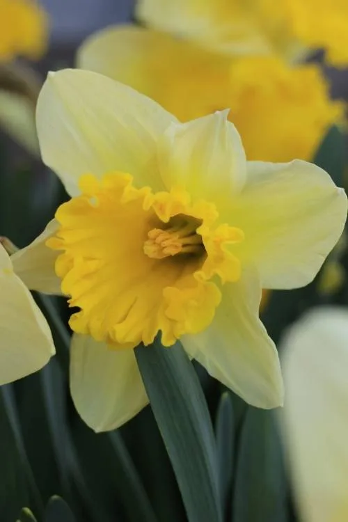 Beautiful lemon yellow trumpet set against white petals. One flower per stem. Introduced in 1981.
